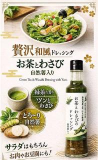 | 静岡のお茶と伊豆天城のわさびを使用したドレッシングです。【お茶は、静岡県川根産の茶葉を特殊製法で加工した緑茶の微粒ペ-ストを使用】栄養価が高く、漢方薬としても使われてきた国産の自然薯が入っています。サラダの他にも焼き魚、焼肉、寿司、鍋物、ベ-コンなどにもお使い頂けます。 |